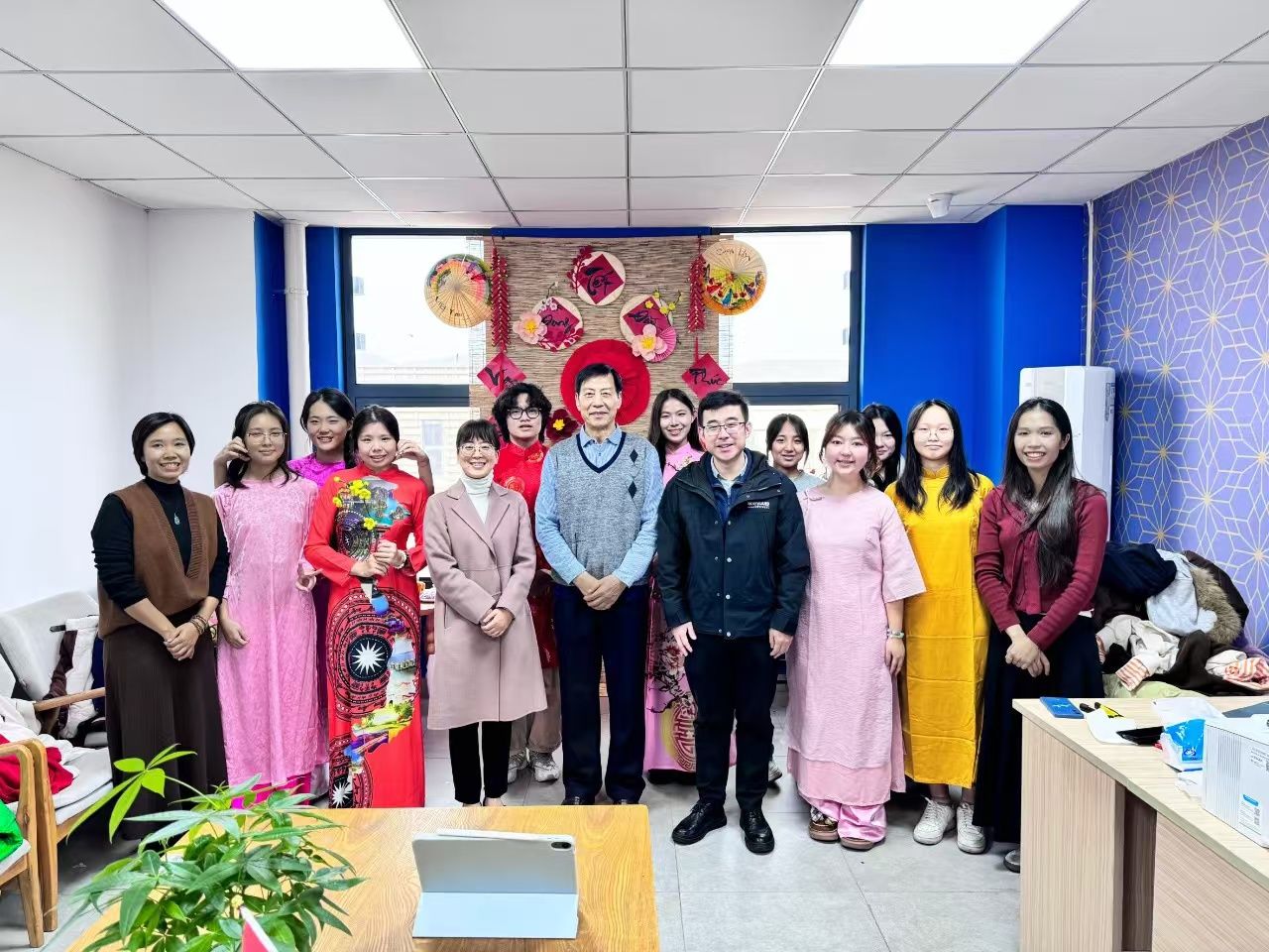 党委书记夏颐、党委副书记宋洋,校特聘教授、越南语系负责人余富兆,越南语系阮云琼、王如芳老师以及24越南语1班的全体同学、肉漫屋