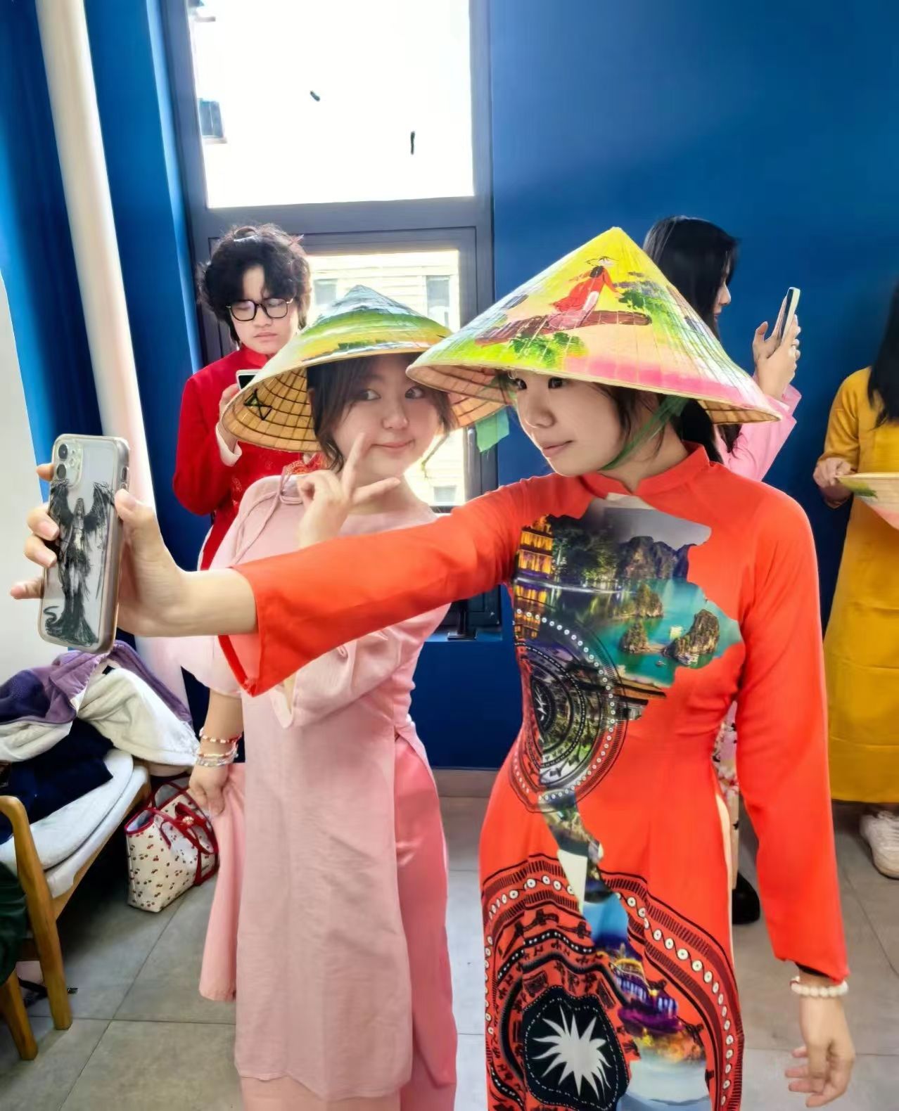 谈及体验奥黛的感受,越南语1班的田金灵同学表示:“穿上奥黛不仅是披上了一件传统服饰,更是一场穿越时空、走进越南文化的奇妙体验,我们能够切身感受越南女性的温婉与端庄,对越南的民俗风情也有了更为直观且深刻的理解和领悟。”