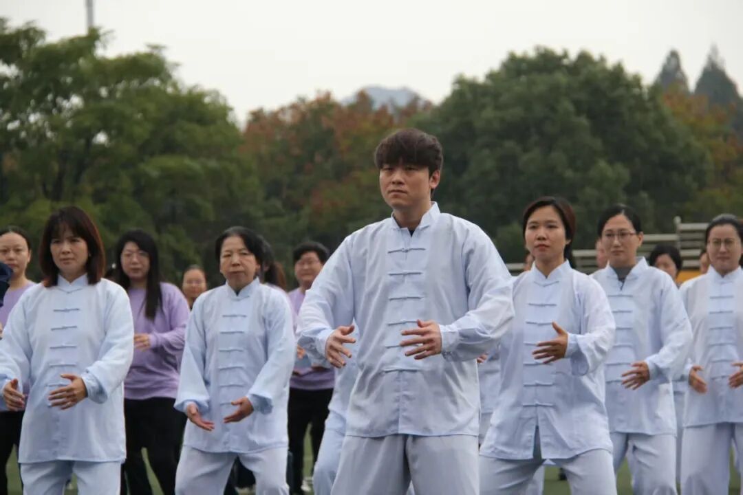 开幕式上,《天地龙鳞》乐声激昂。同学们拳势如云,起落间刚柔并济,尽显沉稳磅礴。教师们演绎八段锦,动作古朴,形气相合,舒展中透着从容气韵。随后,健美操队员以明快节奏与活力步伐舞动青春,将现场气氛推向高潮,完美展现力与美的融合。