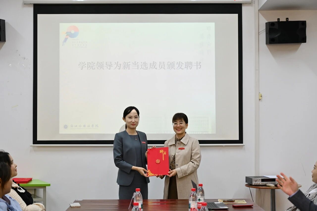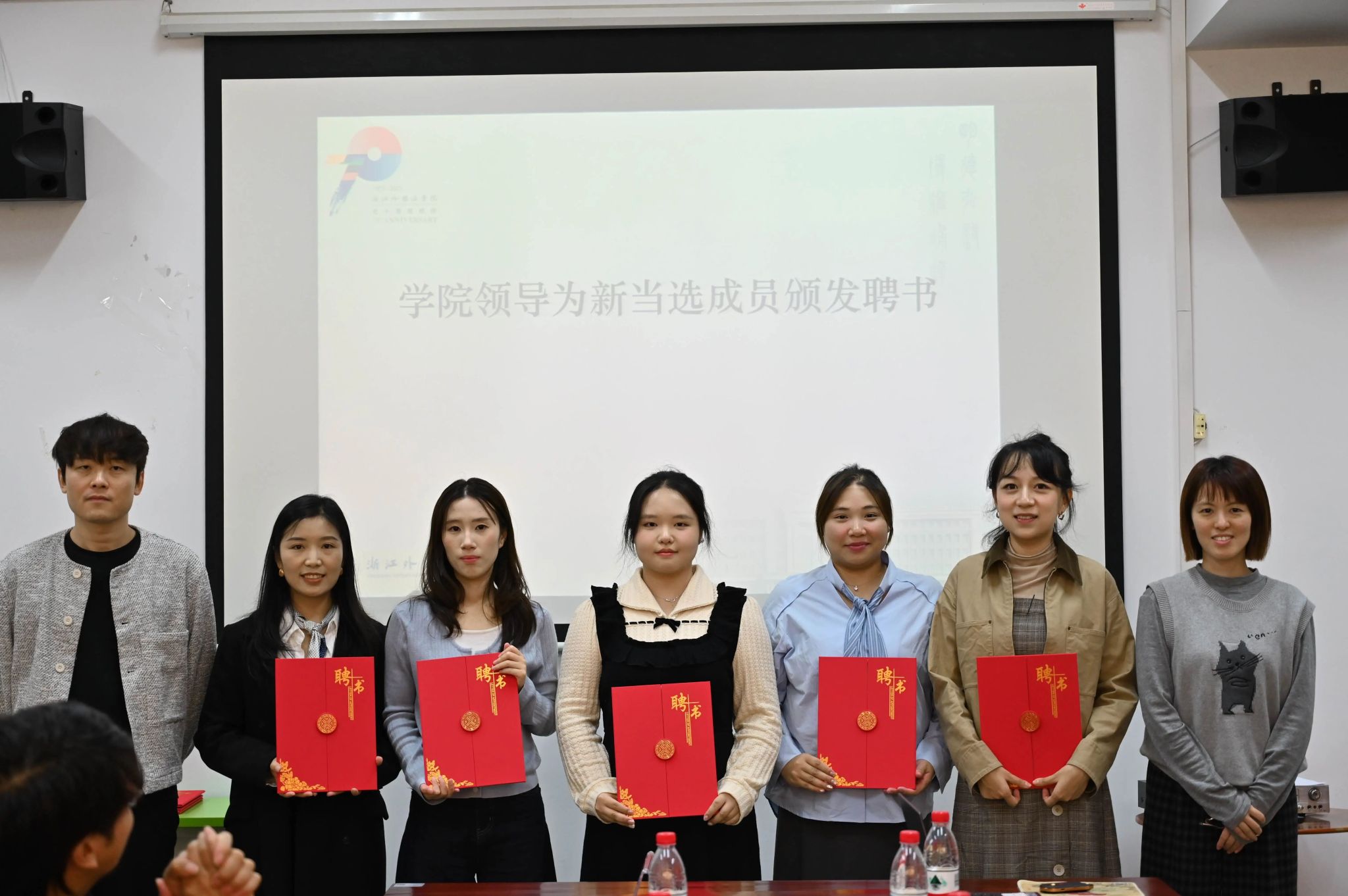会议现场选举产生东语学院第二届校友会理事会,名单如下:会长丁露赟;副会长李力群、许楠爽、林专;秘书长苏宣丞;常务理事毛金萍、张秋雨、江淑君、周雪莲、李帅航、王秀蓉、汪蕾。学院领导为新当选的理事会成员颁发聘书。