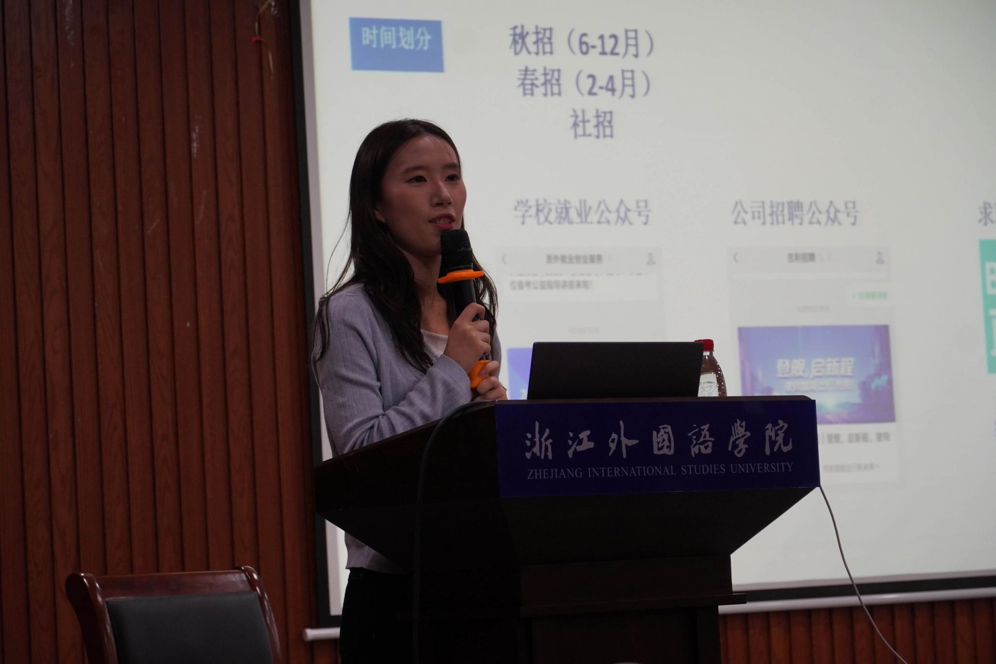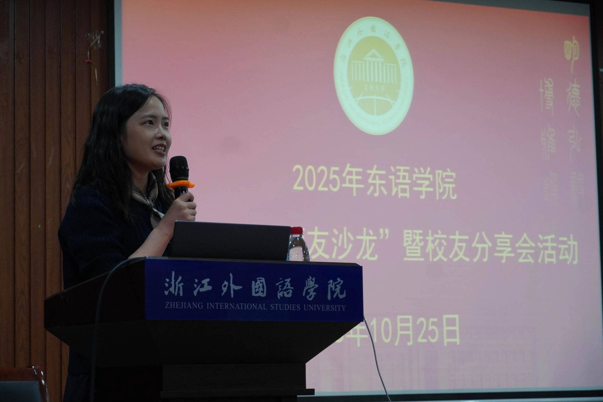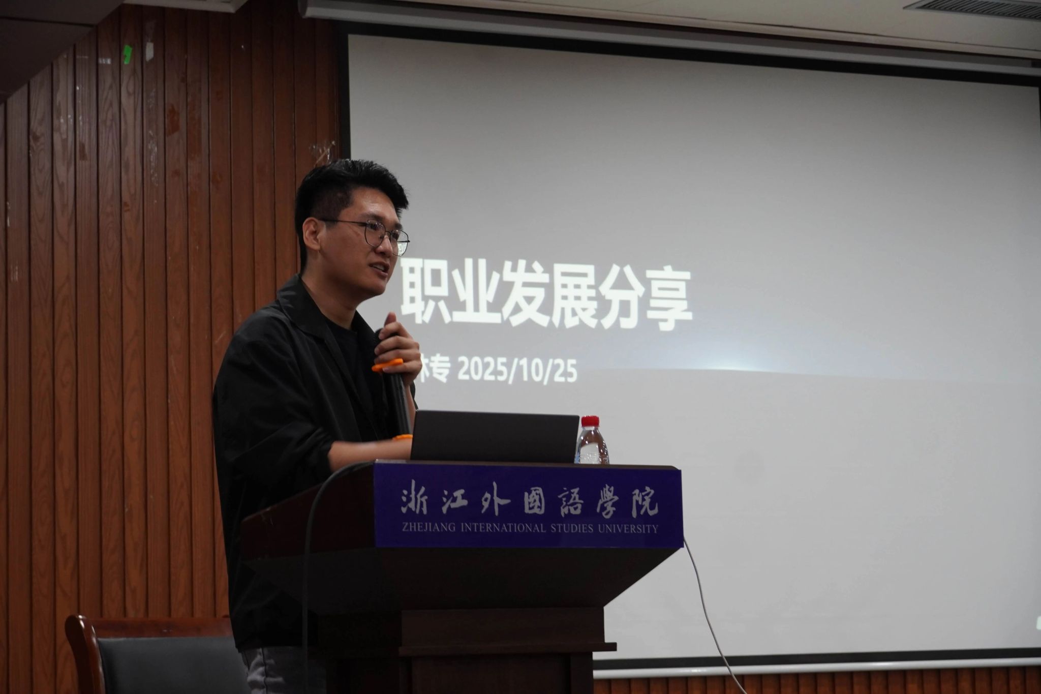 19届阿拉伯语专业毕业生林专,着重强调个人职业规划、教育背景与实习经历对职业发展的重要性,建议同学们在大二、大三阶段主动积累实践经验,积极参与校内外交流活动,拓宽国际视野。21届朝鲜语专业毕业生王秀蓉,结合自身求职经历,指出积累实习经验、搭建人脉网络、关注企业招聘动态是求职过程中的关键要素;同时她还介绍了不同类型企业的运营特点,建议同学们结合个人性格特质选择适配的公司。15届日语专业毕业生张超宇,以教育行业深耕者的视角分享职业经历,强调积累沉淀与自我认知在职业发展中的核心作用。针对工作地点选择,他以产品经理岗位为例,建议同学们结合个人能力与职业规划,理性选择就业城市。18届日语专业毕业生潘富丽,坦诚分享了自己的学习、求职与职业发展历程,提到自己大四时也曾在“考研还是工作”的选择中迷茫,坦言这种困惑是毕业生的正常状态;她同时呼吁同学们珍惜在校时光,勇于尝试新方向,坚定自身能力与潜力。24届日语专业毕业生王晨璐,回顾了大学四年的成长经历与毕业后的工作现状,鼓励学弟学妹们拓宽视野、勇于探索未知领域,不必畏惧社会与校园的环境差异,以积极心态迎接未来挑战。