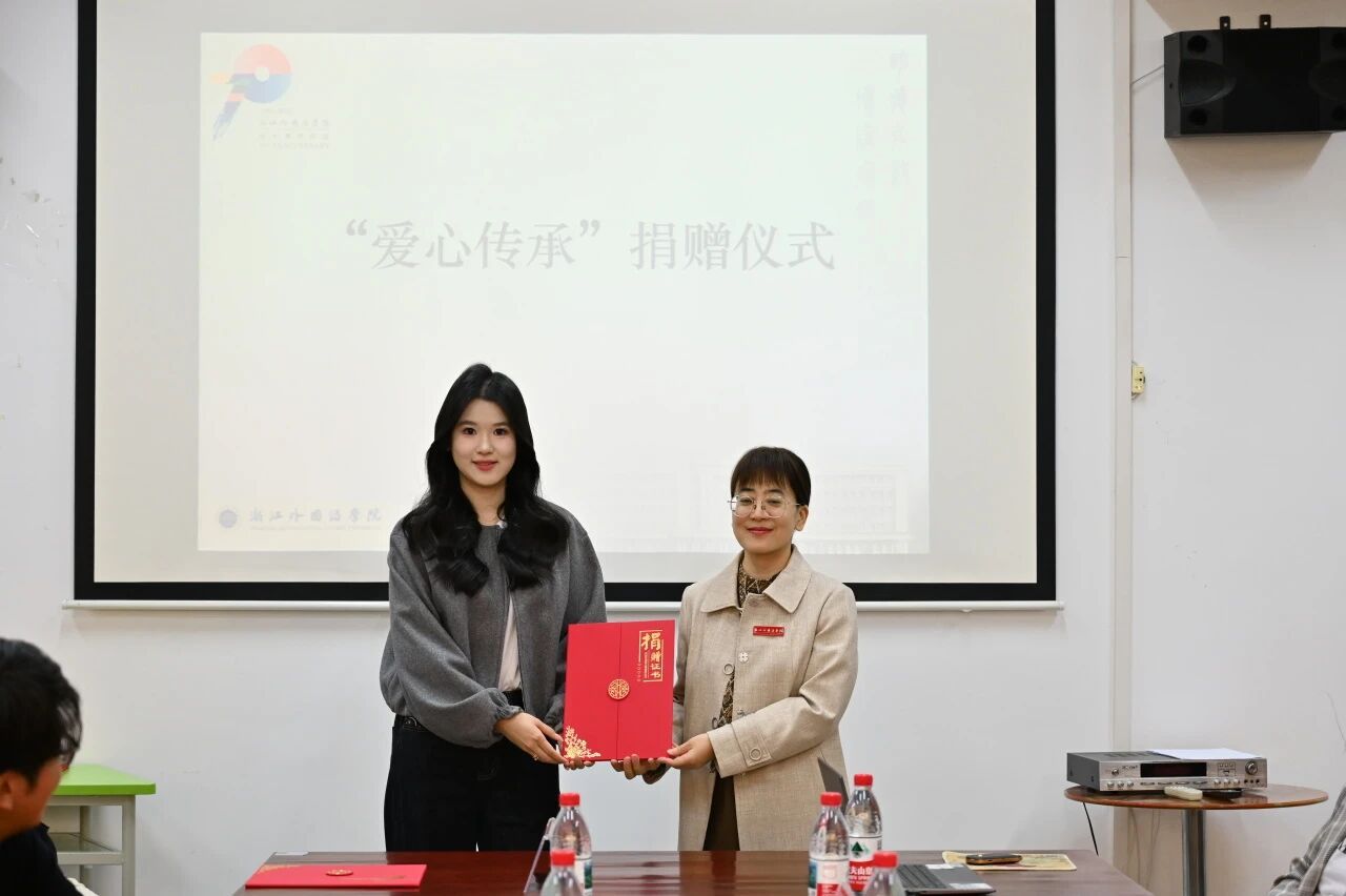仪式现场还举行了“爱心传承”捐赠仪式,学院为郭佩文、丁露赟、李力群、周雪莲、伍江丽等参与捐赠的校友颁发捐赠证书。活动最后,全体与会人员齐唱校歌,悠扬的旋律承载着共同的青春记忆,为这个秋日留下了“薪火相传”的温暖印记。