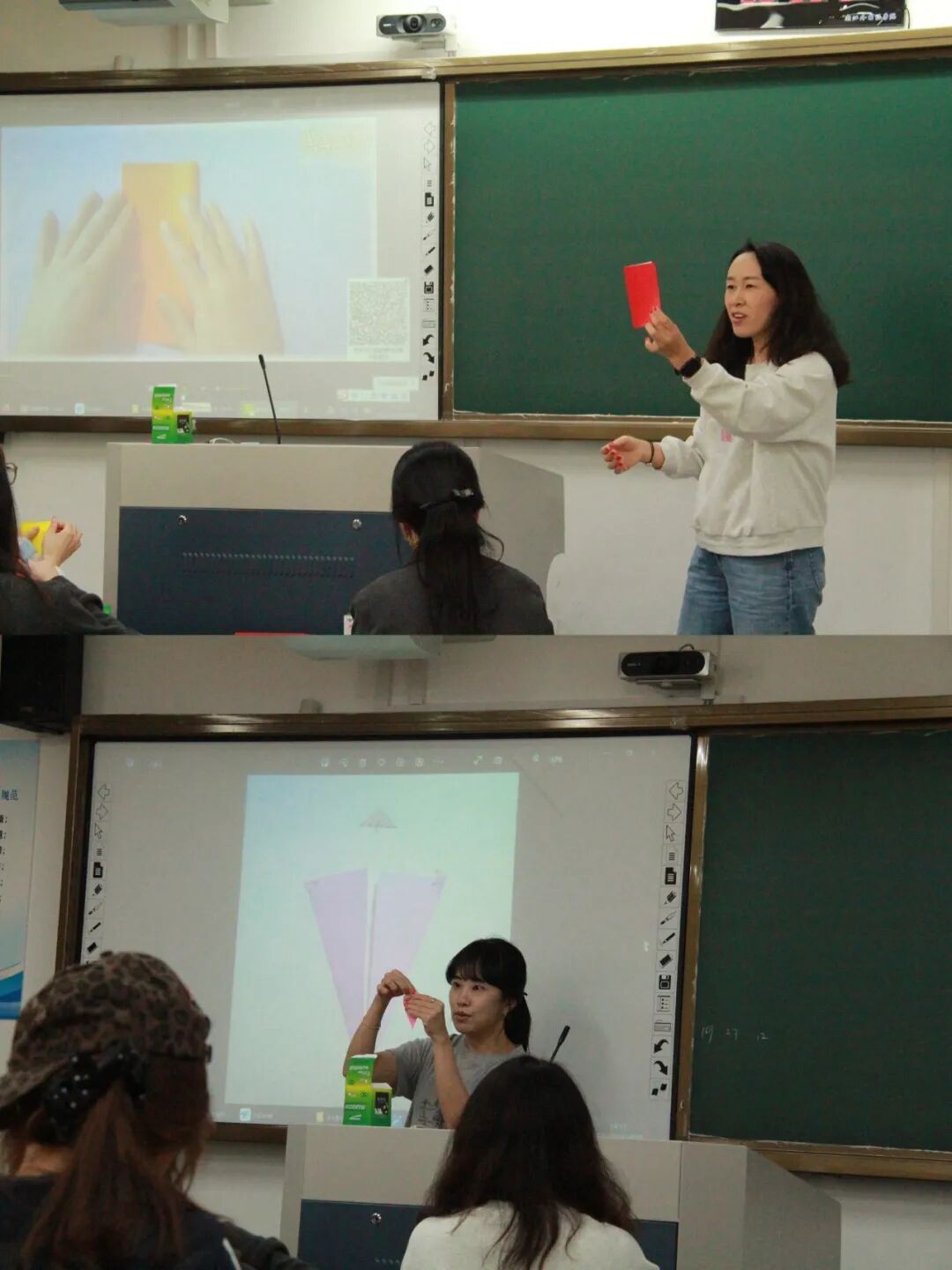 外教朴秀贞与金秀衍老师带领同学们开展折纸活动,共同制作福袋、木槿花与熊猫三种具有文化象征的纸艺作品。从简单的福袋到复杂的木槿花,再到可爱的熊猫,同学们在动手过程中不仅锻炼了耐心与技巧,也加深了对中韩文化符号的理解与兴趣。