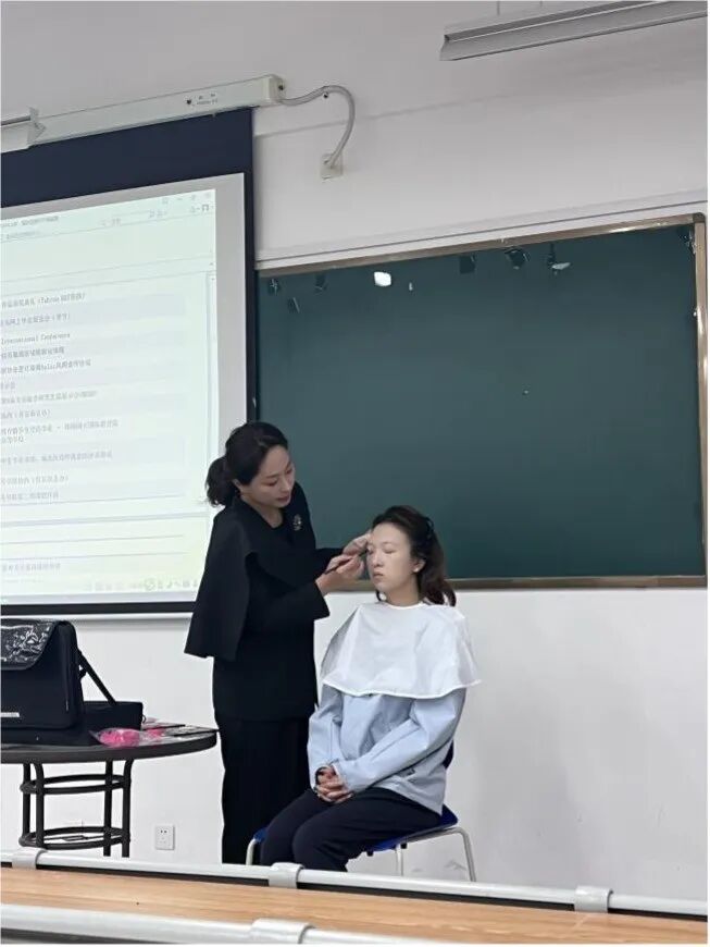 除理论阐述外,讲座还有令人期待的现场化妆展示环节。专家们以一位模特为例,现场演示了如何将理论应用于实践,分别演示了韩式清透水光妆与欧美立体修容妆的打造过程。这一环节直观地展现了审美差异如何具体影响底妆处理、色彩选择与线条勾勒,让抽象的理论变得可见、可感,极大地激发了同学们的兴趣。