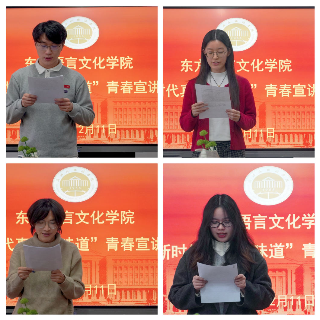 宣讲团成员、24日语3班的张宸嘉以《在时代浪潮中奏响青春华章》为题,将青年习近平在梁家河的奋斗岁月与自己的姥姥张云梅一生坚守戏曲、创业推广家乡文化的经历相结合,展开了一场关于信念与实干、个人与时代的对话。面对信息爆炸、思潮多元的当代环境,他呼吁同学们要学习“千磨万击还坚劲”的坚定信念,筑牢信仰根基,将个人理想主动融入国家发展蓝图,在世界变局中以专业能力传播中国声音。