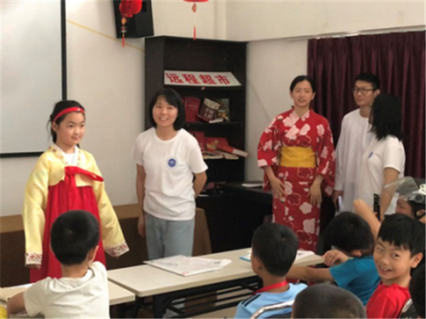 国际文化体验之旅从刘舒悦小老师为小朋友们讲解韩国文化开始,小朋友们通过课堂知晓了韩国的地理位置、国旗样式还有韩国的国花等内容,认真听讲的小可爱们在后面的知识竞猜抢答环节积极举手,正确作答,赢得了实践小队提前准备的阿拉伯特色小甜点。紧接着便是韩国服饰的讲解,设计独到的韩服很是有人气,小朋友们都争先恐后想体验一把。最后一位一直认真听讲的小女孩幸运地得到机会到前面去试穿韩服。这样一节别开生面的韩国文化体验课就结束了。