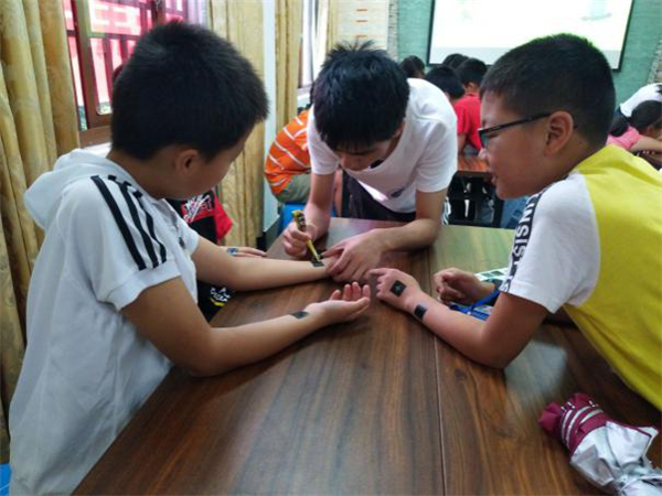 在阿语课程中,阿语系的曹梦飞和柴珠翠小老师又带领大家走进了神秘的阿拉伯一探究竟。穿着阿拉伯长袍的曹梦飞小老师一上台就吸引了所有孩子们的目光,课程开始后大家也是兴趣十足地听老师讲述阿拉伯文化、风土习俗,大大改变了孩子们以前对于阿拉伯国家的看法,并对它们有了全新客观地认识。大家都知道阿拉伯语很难学,但在“学学说句阿拉伯语”环节,每位小朋友们都积极举手跟随老师学说阿拉伯语,优秀的孩子们都得到了小老师的很大认可。最后体验了阿拉伯神秘精致的海娜纹身贴,大家都是酷酷的小朋友啦~(这纹身贴安全无害的哦)