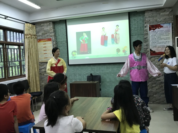 韩语系的刘舒悦、康佳辉、王如婕同学分别为小朋友带来了韩国概况、韩服体验、和韩国美食课程。通过这些课程小朋友们知晓了韩国的地理位置、国旗样式还有韩国的国花等内容,认真听讲的小可爱们在后面的知识竞猜抢答环节积极举手,正确作答,赢得了实践小队提前准备的阿拉伯特色小甜点。听完韩国服饰的讲解后,设计独到的韩服大受欢迎,小朋友们都争先恐后想体验一把。最后,一位一直认真听讲的小女孩幸运地得到机会到前面去试穿韩服。最后的美食课程大家看着鲜嫩多汁的烤肉、营养美味的石锅拌饭还有精致可爱的打糕忍不住想象在吃美食的画面。