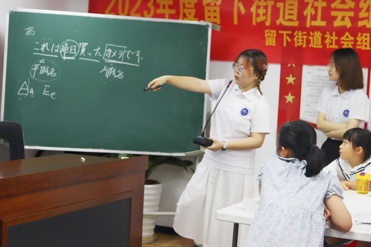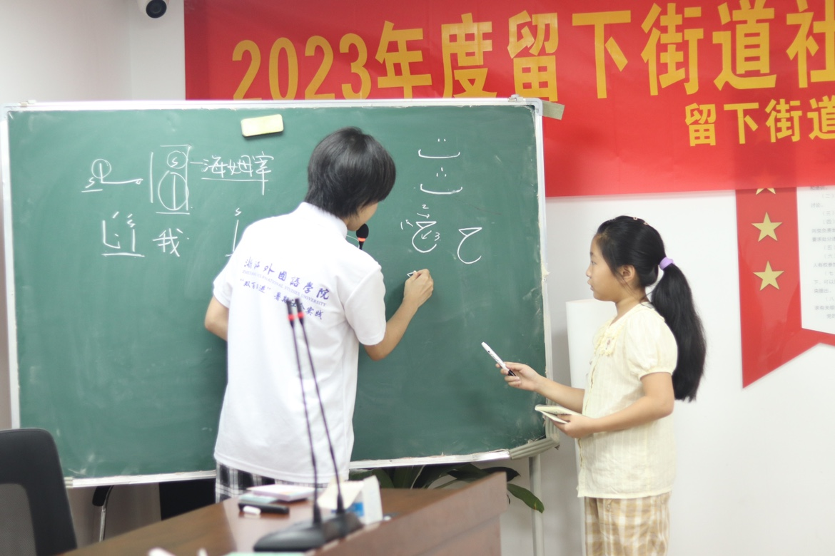 有了文化体验课,自然也少不了语言学习课。平时在大学课堂里认真听讲的大学生们,在社区里摇身一变成了“小老师”,为孩子们带去一节节生动有趣的外语教学课程。从字母的发音到句子的书写,从日常问候语到水果蔬菜的读音,队员们绞尽脑汁,设计出适合低年龄段孩子们的外语学习课,力求严谨不失趣味、质量与课堂效果两手抓。