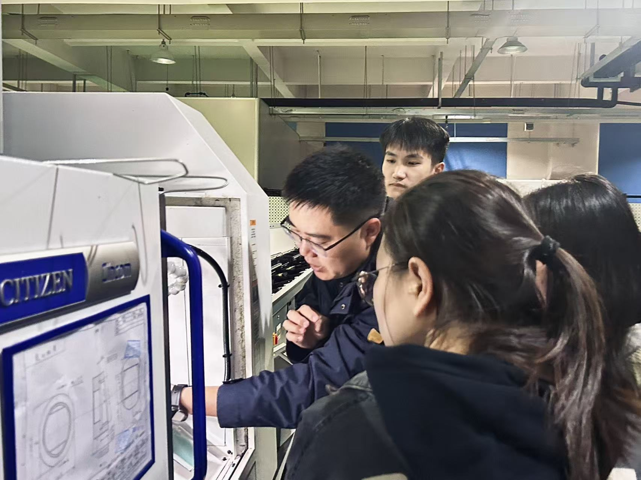 随后,师生们走进精密制造车间,实地观摩高端医疗器械核心部件的生产流程。车间内,高精度数控走心机等核心设备平稳运转,直观展现出公司在精密零件加工领域的技术硬实力。技术人员结合设备运行实际,详细讲解了关键设备的工作原理、操作规范及技术优势,同时分享了公司以日本奥林巴斯、富士光学等行业头部企业为标杆,持续攻克技术难关、推动内窥镜等高端医疗器械国产化的发展目标与“破局”决心。同学们通过讲解了解到,过去我国医院在高端内窥镜设备方面高度依赖进口,而在国家大力推进医疗供应链自主可控的政策支持下,以鑫泽源为代表的企业正不断突破国外技术壁垒,逐步实现关键医疗设备国产化替代,肩负起保障医疗领域关键技术自主可控的历史使命。