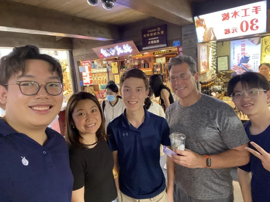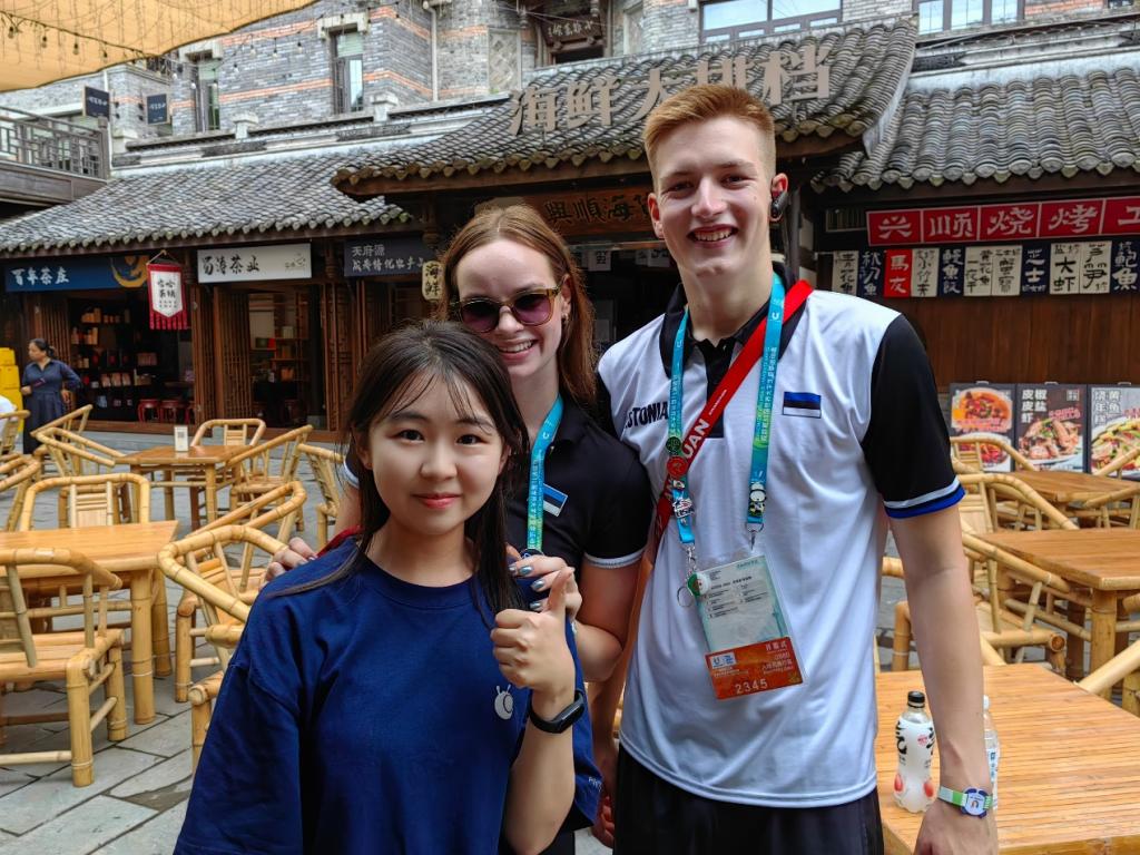 王晨璐(右一)在宽窄巷子与来自新加坡的运动员合影留念