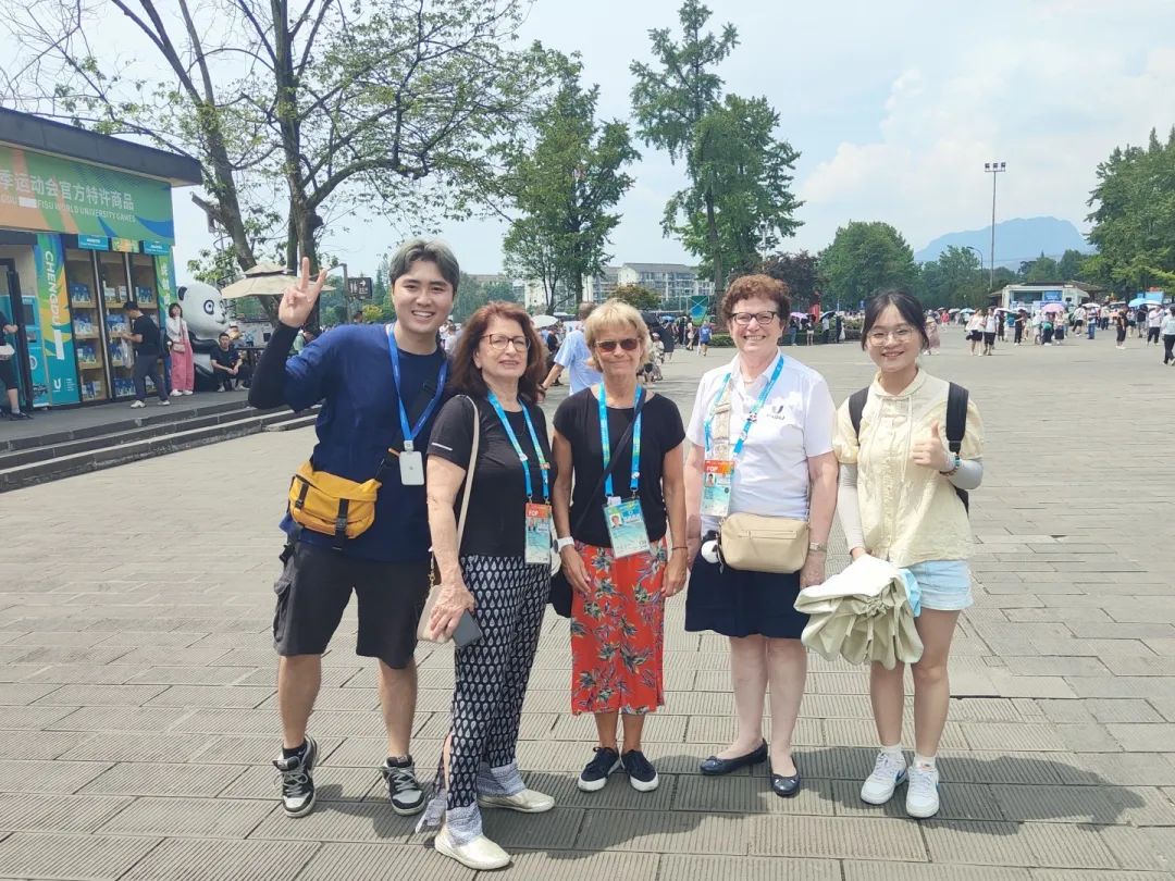 陈庆玶(右一)在都江堰景区与来自澳大利亚、意大利的大运会裁判合影留念