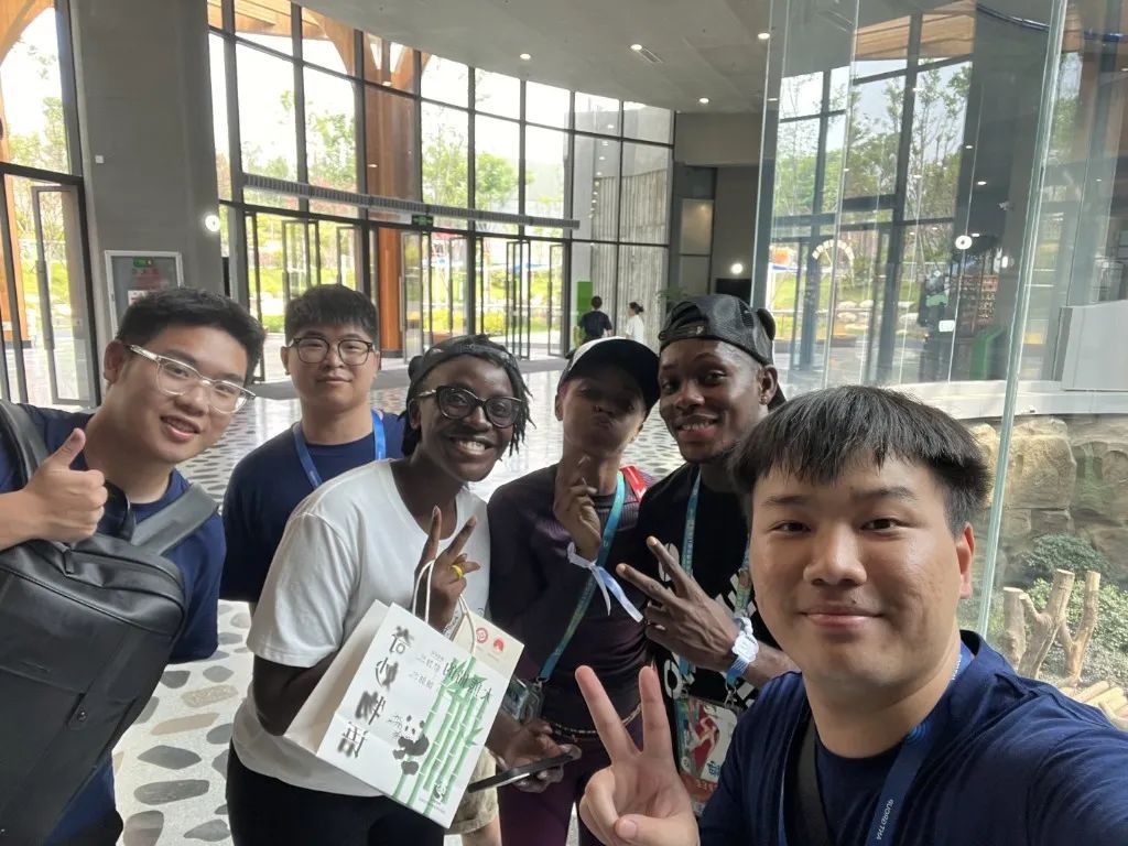 张涵(左一)在熊猫基地与来自塞拉利昂和坦桑尼亚的运动员合影留念