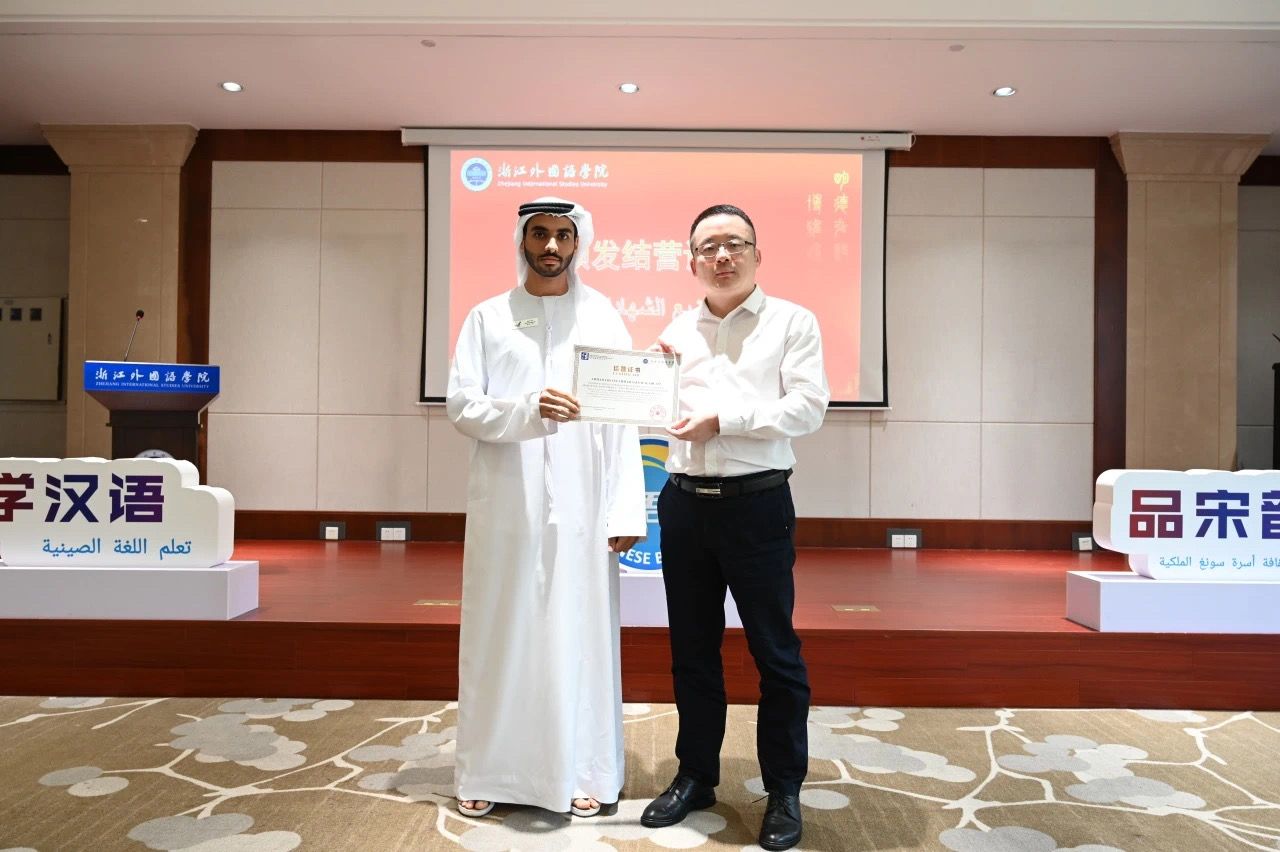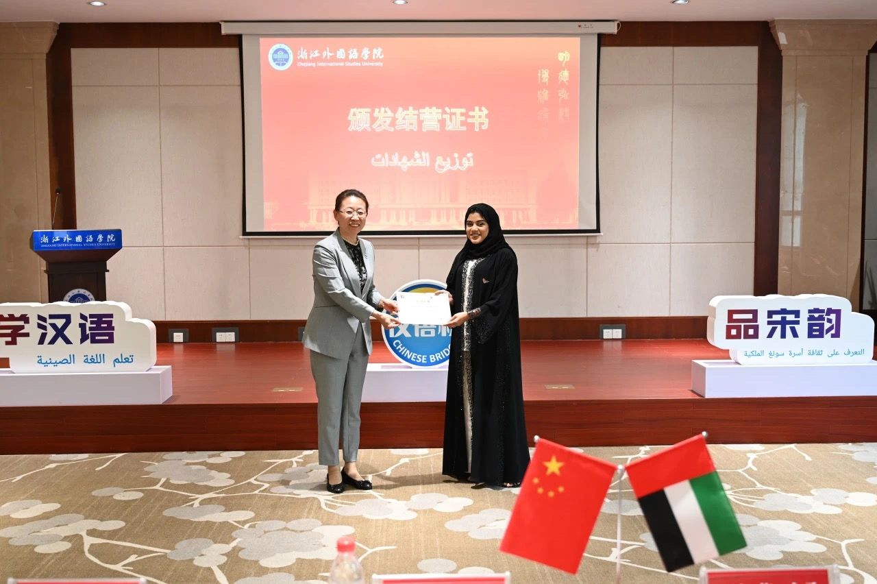随后,柴改英为阿联酋教育部创新创业司活动和会展主管阿伊莎·哈桑女士颁发结营证书。校国别和区域研究中心主任周烈为阿联酋学生“汉语桥”团组带队教师马蒂亚斯·勒特梅先生和戴京倞女士颁发结营证书。与会其他嘉宾分别为27名营员颁发结营证书。