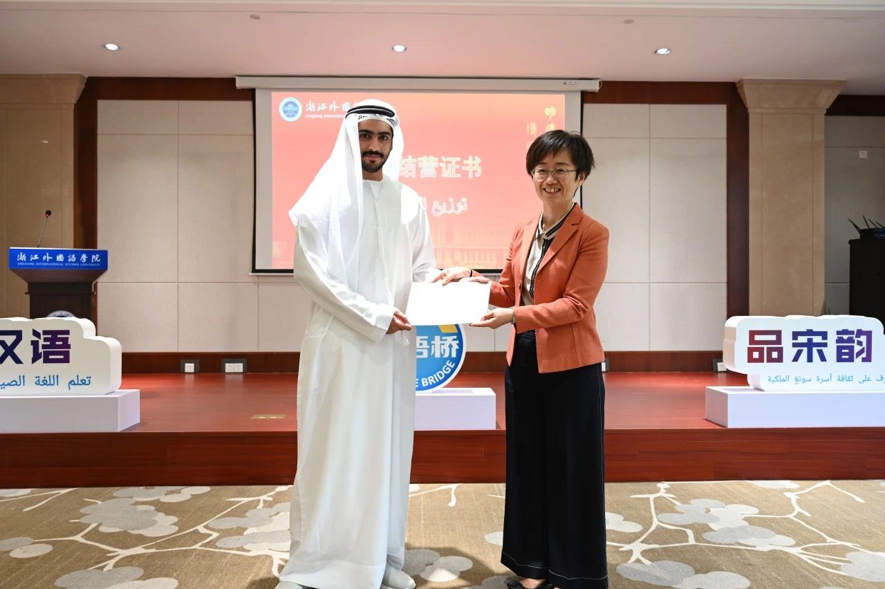 柴改英在致辞中谈到,本次“汉语桥”春令营使中阿青年敞开心扉,互相帮助,在十几天里结下了美好情谊。她期待“汉语桥”作为一座连接中国与世界的文化桥梁,能够继续发挥其独特作用,吸引更多热爱文化多样性的朋友来到中国;也期待营员们能够将所学所得带回自己的国家,推动中阿之间、浙外与迪拜大学之间在“外语人才培养”“大学生创业创新”“电子商务培训”“教师教育”等方面开展更多务实的合作。