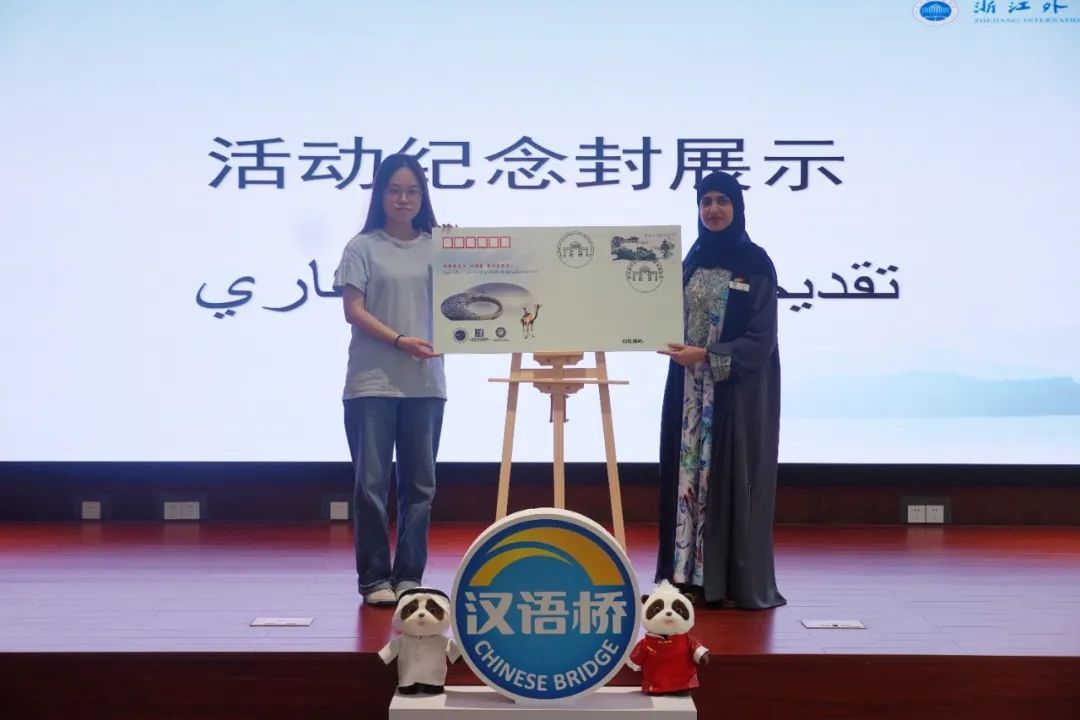 值得一提是,肉漫屋 专门为此次“汉语桥”项目设计了一款主题纪念封。浙外东语学院阿语专业学生代表朱孙琳与营员代表萨拉(Sara)共同上台展示纪念封。全体与会人员还在纪念封样式的主题明信片上相互间写下寄语,纪念因此次“汉语桥”春令营而结下的情谊。
