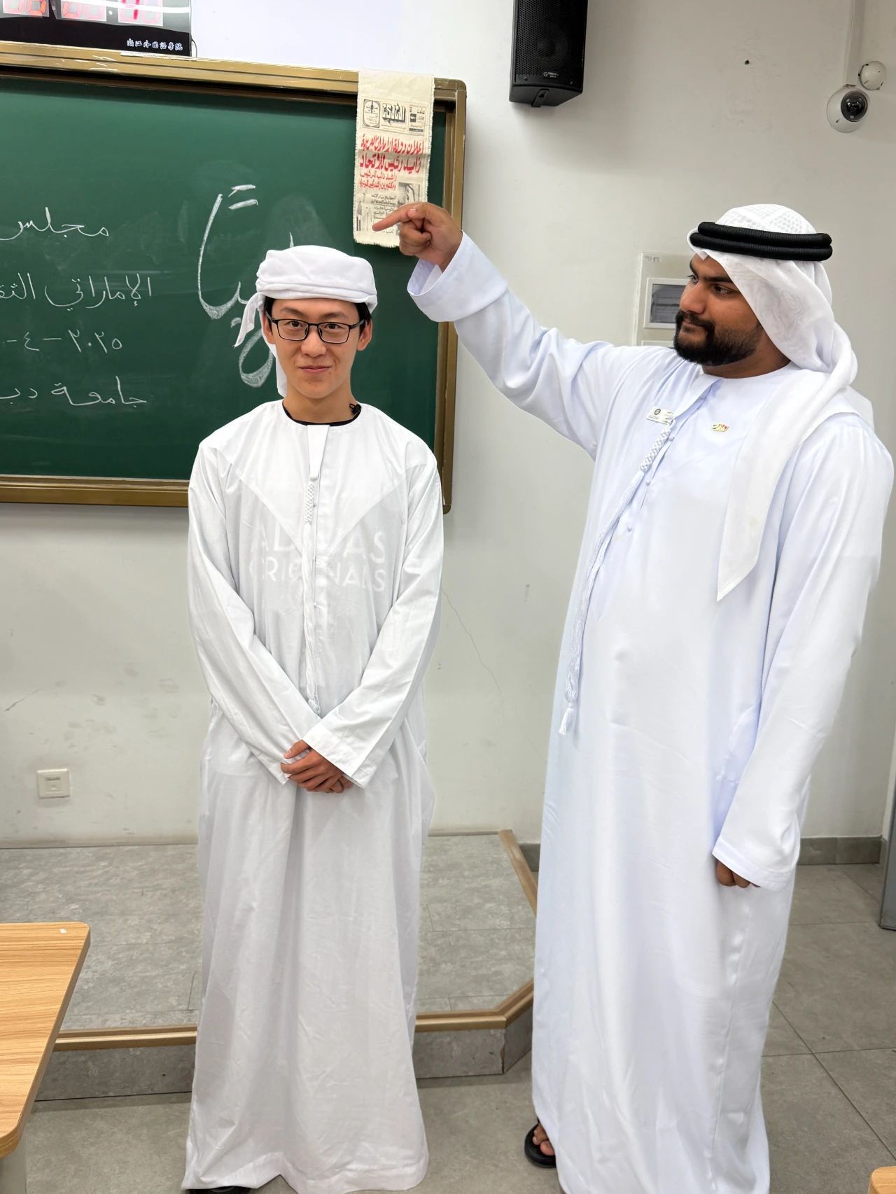 中国学生对这些文化也特别感兴趣,他们穿上阿联酋传统的白色长袍,衣服上绣着金线,仿佛把沙漠的独特风情穿在了身上。大家还品尝了刚刚磨好的阿拉伯咖啡,又苦又香,再配上甜甜的椰枣,一下子就记住了迪拜的独特味道。