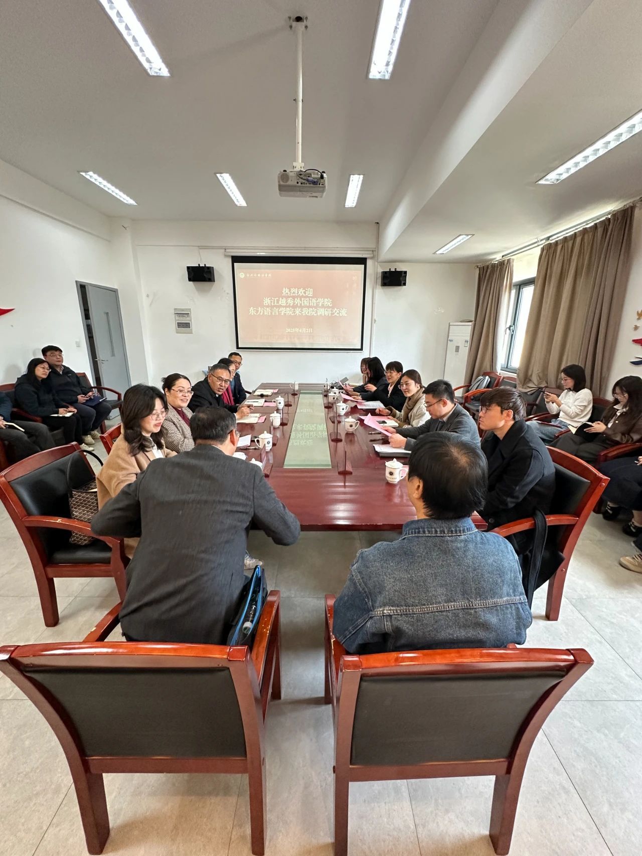 全体领导班子成员、各系主任(系副主任)、教师代表,浙江越秀外国语学院东方语言学院全体领导班子成员、各系主任或系副主任等参加交流。