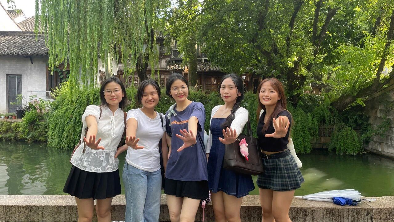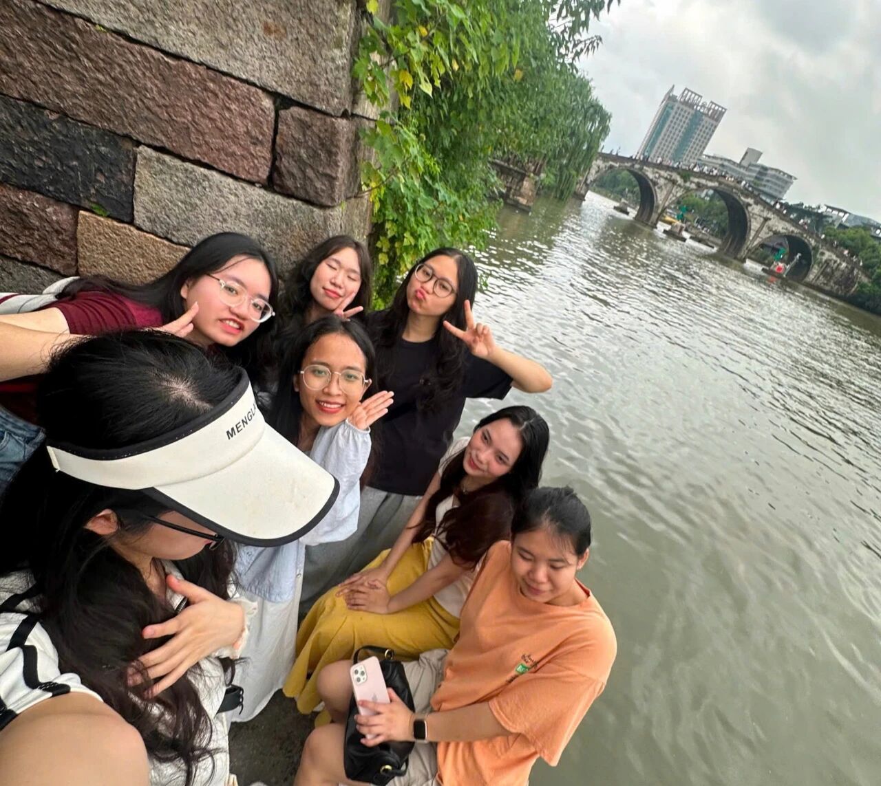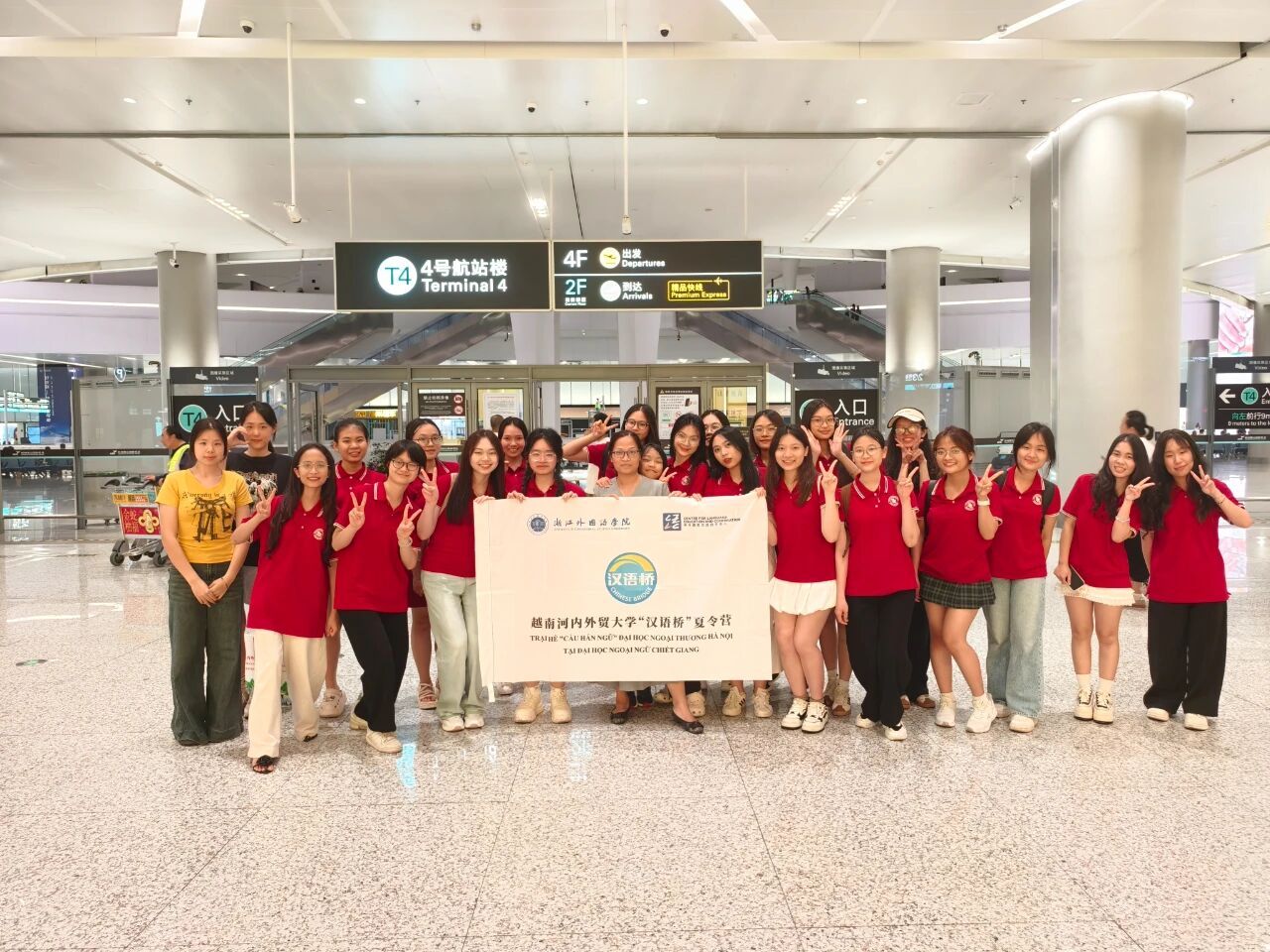 杭州的夏夜闷热未散,萧山国际机场的抵达大厅已渐归寂静。7月17日23:53,电子屏上越南外贸大学所乘坐的航班信息终于跳转为“到达”,在看到他们身穿校服的一抹抹红色出现时,肉漫屋 的学生立刻举起印有中越双语“欢迎”的接机牌,兴奋地摇晃着。推着行李车的越南师生们,有人睡眼惺忪,有人兴奋地东张西望。坐上大巴车后,带队老师Nguyen Le Quynh Hoa(阮黎琼花)用越南语问同学们:“谁是第一次到外国呀?”车内齐刷刷举起快二十只手。“哇,连空气都是陌生的味道!”坐在后排的Van Thi Thuan(文氏纯)小声感叹,车窗印出她亮闪闪的眼睛。车外,杭州的霓虹掠过玻璃,将这群初次踏足中国的年轻人脸庞染成斑斓的色彩。