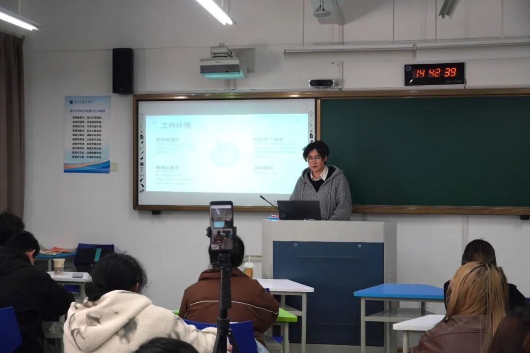 学院2025届毕业生沈天寻结合自身入职后的工作经历,与学弟学妹们分享职场感悟。他从企业开放务实的文化氛围、完善的人才培养机制、双通道晋升体系,以及多元贴心的员工福利等方面展开介绍,用真实的体验为同学们勾勒出企业的工作与发展环境,让大家对企业有了更直观、更深入的了解。