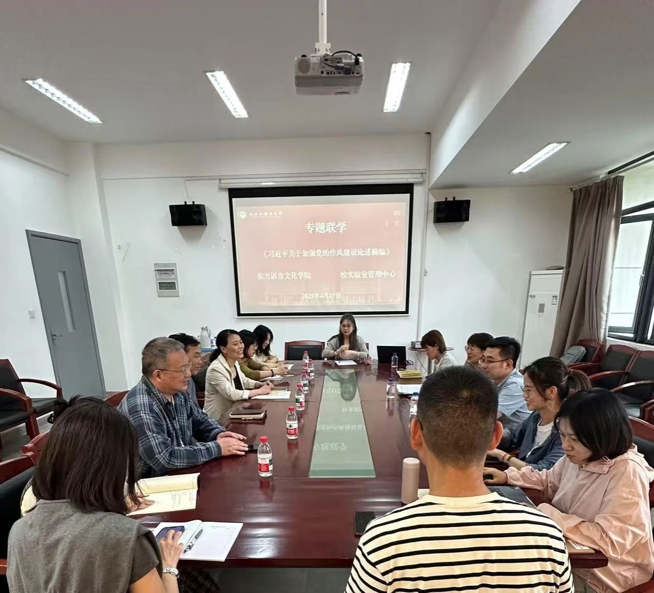 党委与校实验室管理中心党支部在融院C401会议室举行习近平总书记关于加强党的作风建设的重要论述理论学习中心组专题联学会。东语学院理论学习中心组、校实验室管理中心党支部全体成员参加学习。学习会由东语学院党委书记夏颐主持。