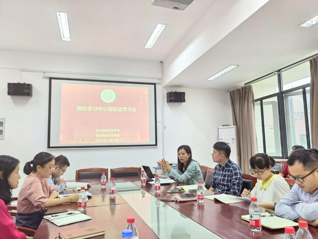 东语学院和英文学院班子成员分别围绕“《习近平谈治国理政》第三卷主体内容及学习方法”、“学习党史的现实意义”、“如何丰富学生思政教育内容和形式”、“结合党史学习教育如何推进学院学科建设和人才培养、如何推进‘三进'工作”等方面进行了交流发言。