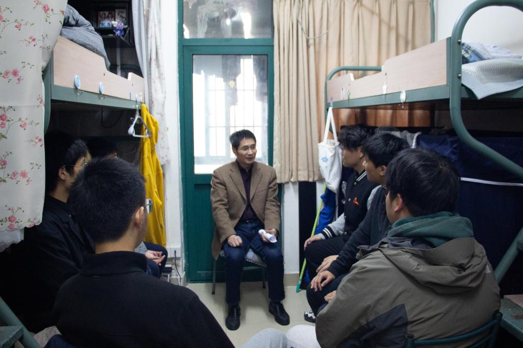 在寝室,同学们与洪校长围坐一团,洪校长仔细询问了每位同学的家乡籍贯、专业班级、目标规划。洪校长叮嘱新生说:相比于我们那个年代的物质条件,当今大学生的学习条件是很优越的,希望你们能在今后的学习生活中,找准自身方向,度过有意义的大学时光。