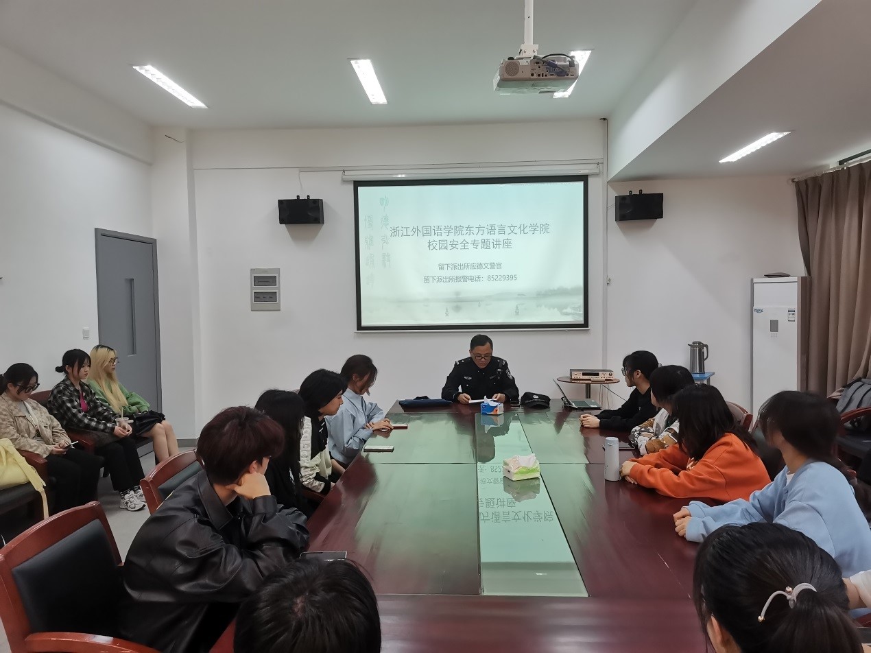 为加强校园安全宣传教育,切实增强学生安全意识,有力保障学生人身财产安全,建设平安校园,4月27日,东语学院举办“校园安全”专题讲座。讲座邀请了留下派出所应德文警官作为主讲人,各班安全信息员参与讲座。