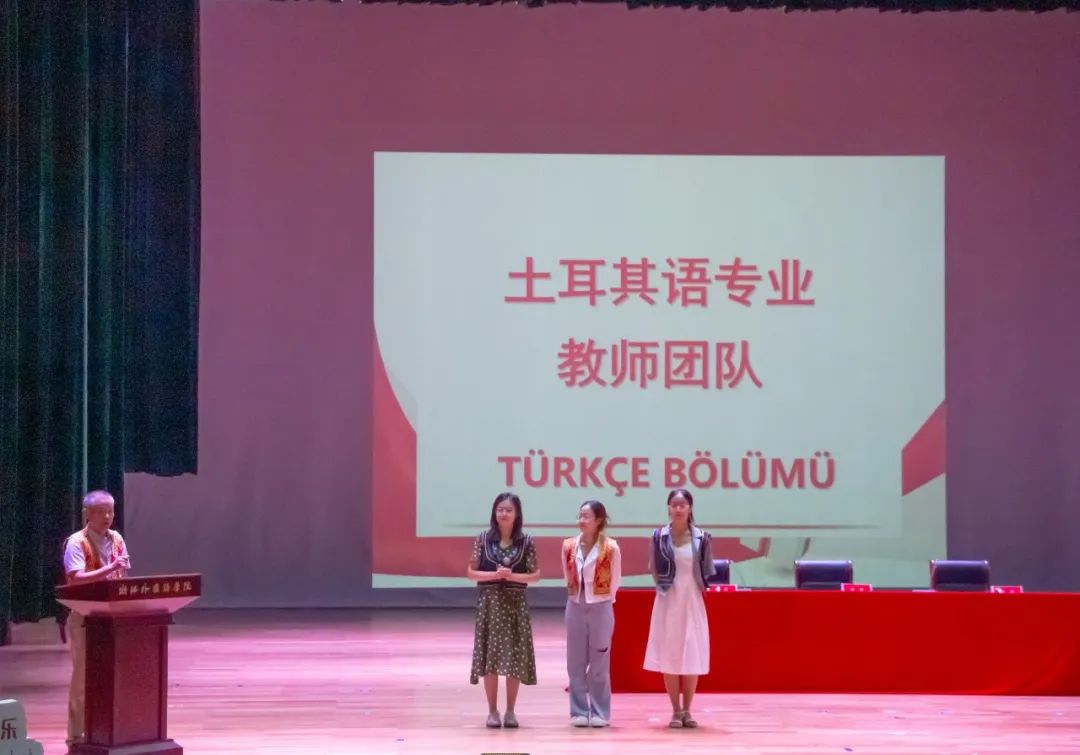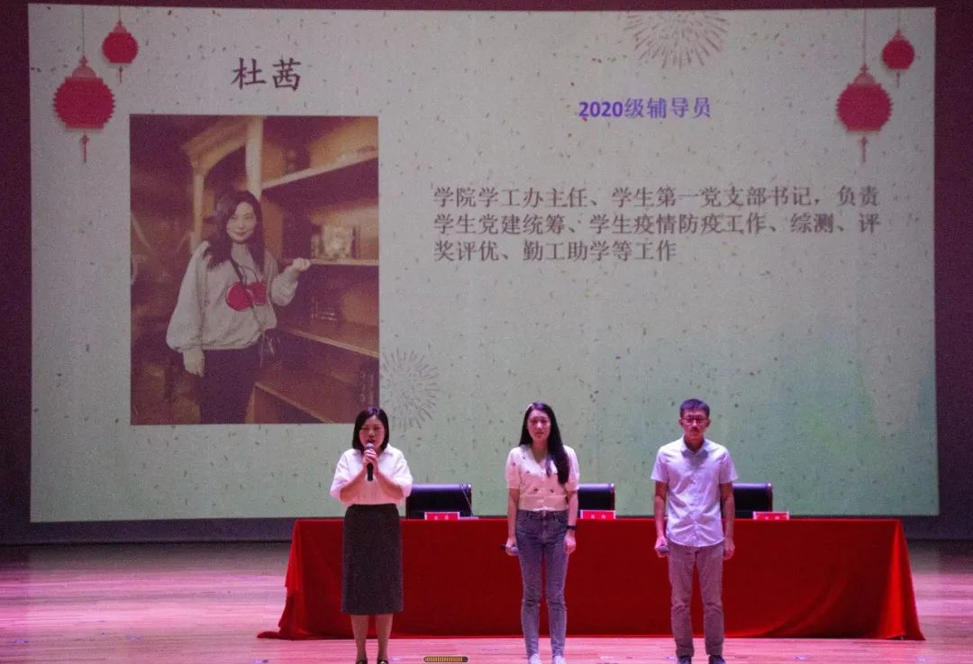 师生见面会环节,学院各系的老师们身着语言对象国的传统服饰依序登台,向新生们作介绍。他们各具特色、生趣活泼的介绍,拉近了与新生们的距离,也使同学们对所学专业有了初步的认识。老师们精神饱满,神采奕奕,给新生们送上了真挚地祝福与鼓励。辅导员老师们也登上舞台,向新生们送上美好的祝愿与期许。