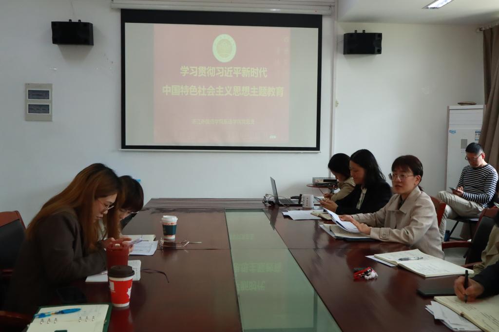 会上,从深刻认识开展这次主题教育的重大意义、全面准确把握主题教育的目标要求、切实加强对主题教育的领导三个方面集中学习了习近平总书记在学习贯彻习近平新时代中国特色社会主义思想主题教育工作会议上的讲话精神。会议专题学习了《习近平著作选读》《习近平新时代中国特色社会主义思想的世界观和方法论专题摘编》《习近平新时代中国特色社会主义思想学习纲要(2023版)》等学习材料。党总支书记夏颐表示,要牢牢把握开展主题教育的重大意义和总体要求,以目标为导向,深入检视整改自身在理论学习、政治素质、能力本领、担当作为、工作作风、廉洁自律等六个方面的问题,全力推进主题教育走深走实。院长吴玲表示,要大兴调查研究之风,开展浙外非通语种应用型复合型人才培养模式调研,系统谋划人才培养模式创新,着力提升人才培养质量。副院长曹笑笑谈到,要坚持重点学习、有针对性地学习,脚踏实地,稳扎稳打做好工作,真正确保主题教育取得实效。党总支副书记宋洋表示,要以理论为依托,把握好时间节奏,把理论学习、调查研究、推动发展、宣传教育等有机融合、整体推进,把每项工作都做扎实做到位,确保学出成效、做出实绩。