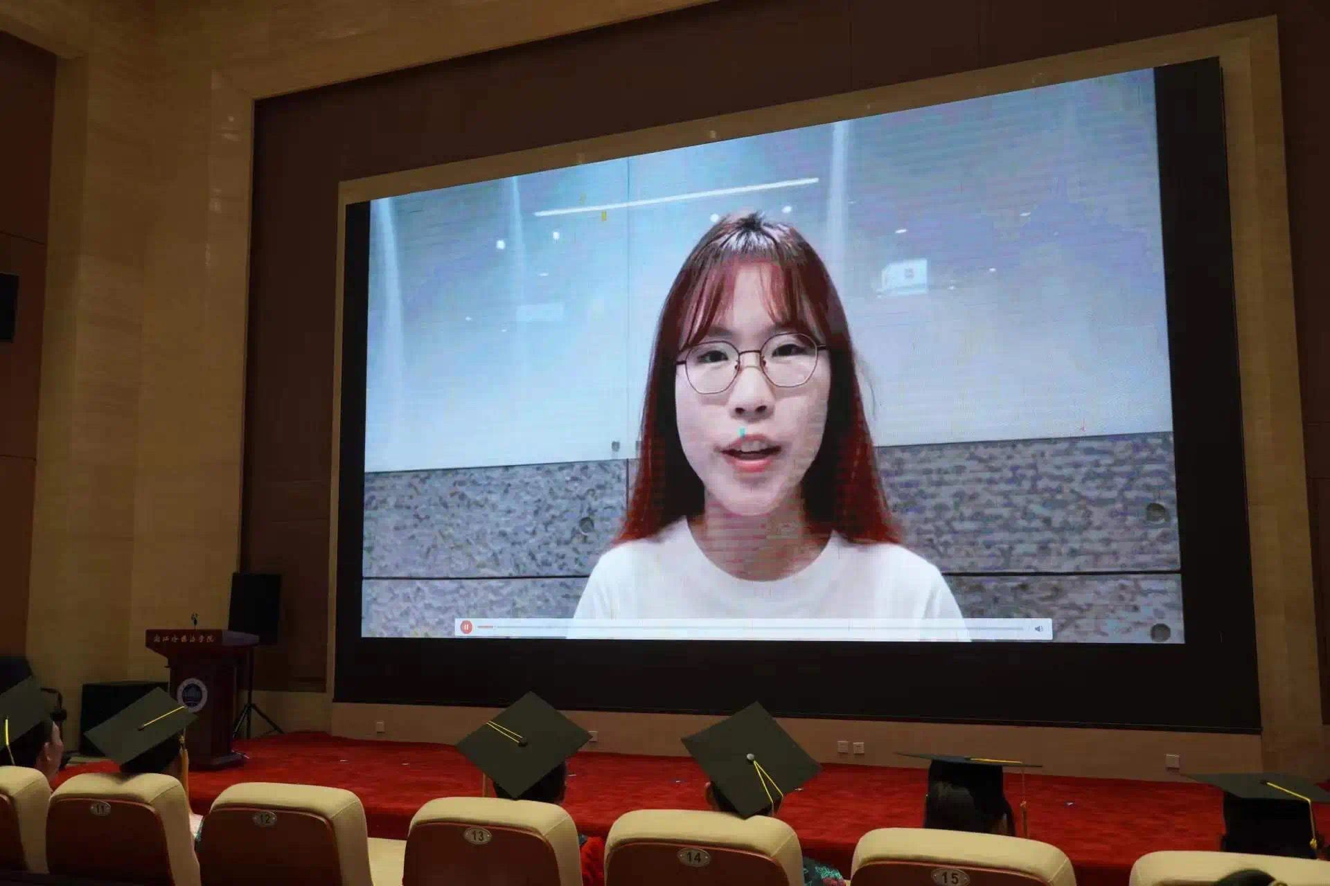 校友代表日语2019届校友周吕燕用视频的形式向毕业生们分享了她从北京大学研究生毕业后的奋斗经验,希望毕业生们要不断输入新的知识,要明确奋斗目标并积极行动,要随时拥有重新启程的勇气和自信。