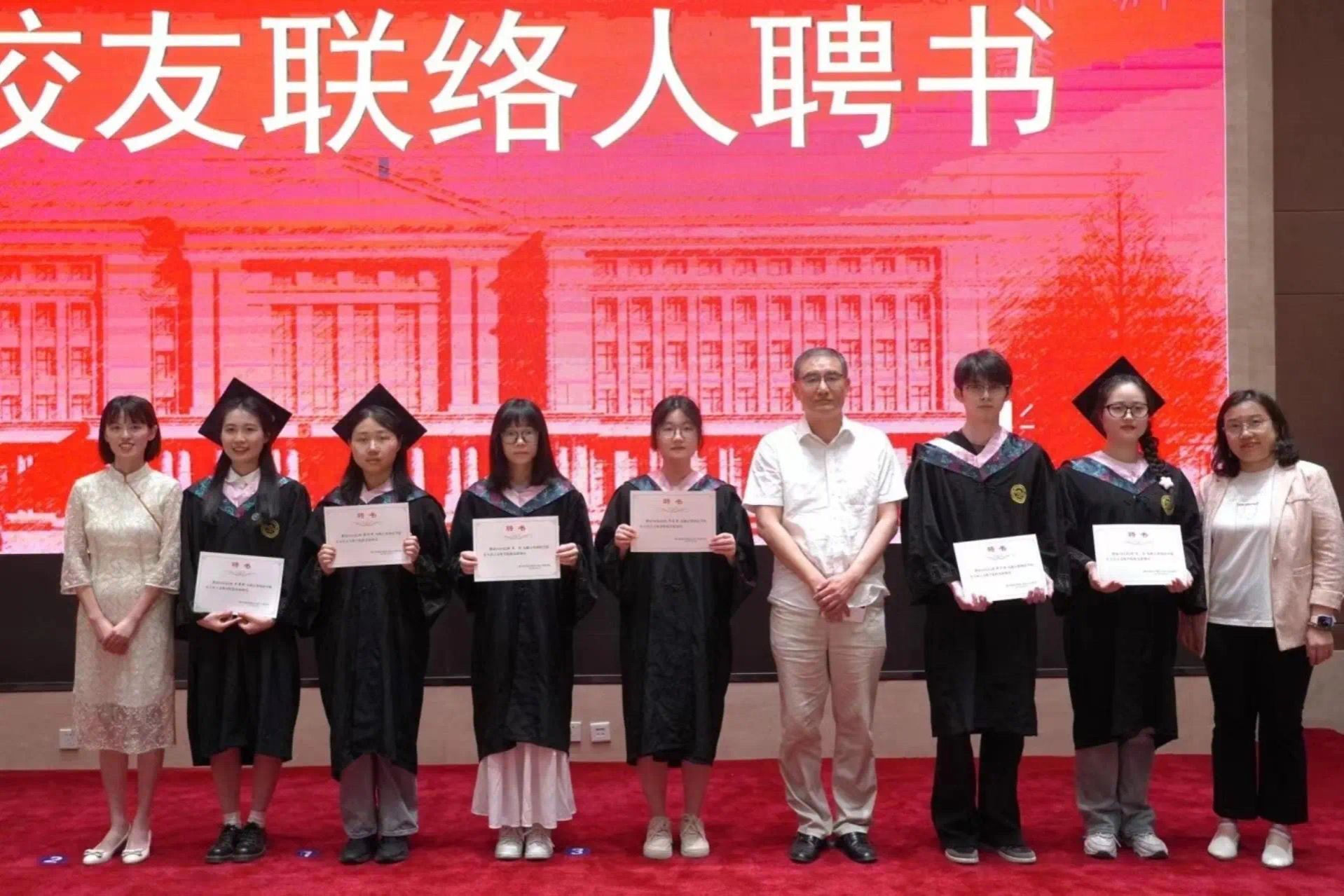 毕业班班主任为校友联络人颁发聘书并与他们合影留念。