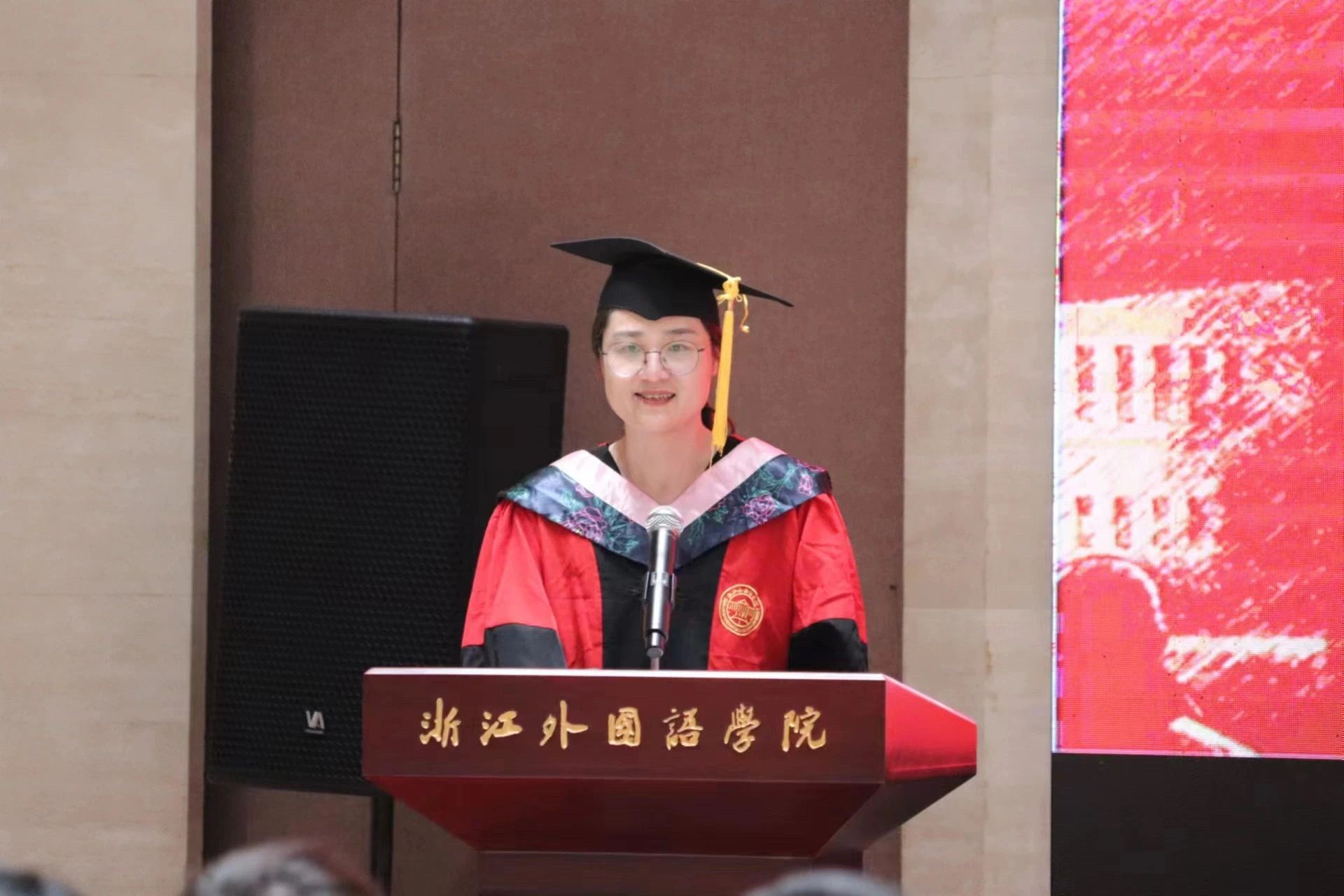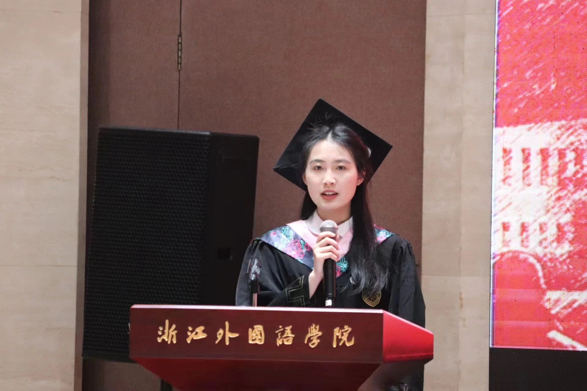 日语专业王晨璐同学代表毕业生发言。“饮水思源,结草衔环”,她表示永远不会忘记自己浙外人与东语人的身份,不会忘记校训与浙外精神。向同学们表达了“乘风破浪、行而不辍”的美好祝愿,为学院与老师们送上了衷心的祝福。