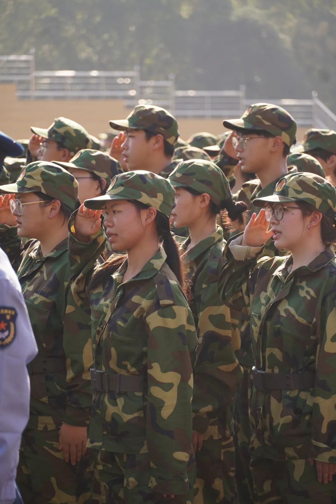 骄阳下闪耀的五星红旗徐徐升起,全体新生身着整齐的迷彩服,昂首挺胸、身姿挺拔,目光坚定地注视着国旗,庄严敬礼。