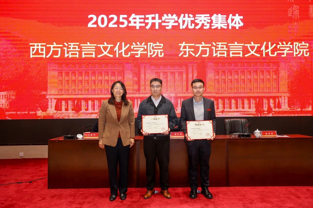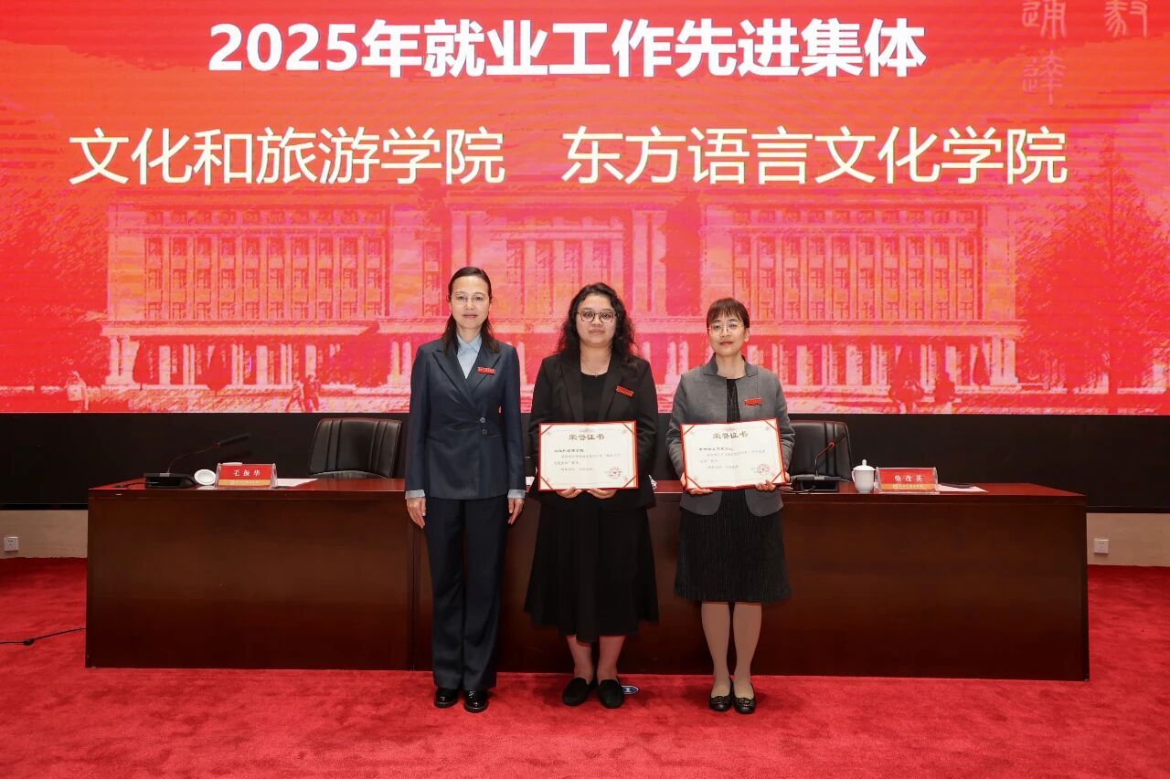 分别荣获学校2025年“就业工作先进集体”和“升学优秀集体”称号,辅导员蔡胜、日语系教师寿舒舒荣获学校2025年“就业工作先进个人”称号。学校领导为获得殊荣的学院和个人颁发荣誉证书。