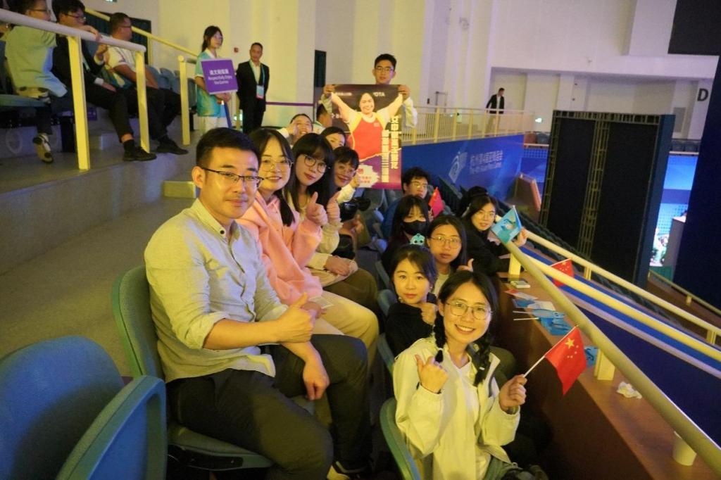 12名师生前往萧山体育中心体育馆,为谭玉娇加油助威,现场见证了她在“家门口”实现亚残运会三连冠的壮举。