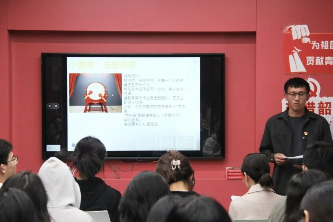 下半场活动由蔡胜主持。他带领大家,通过击鼓传花的形式选取朗读者,朗读从《觉醒年代》中选取的金句,希望以此来激励大家。