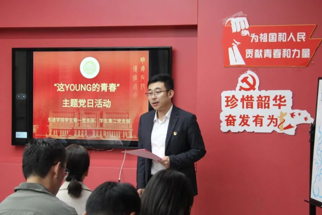 在弘文馆二楼中庭研修室召开“这YOUNG的青春”主题党日活动。东语学院党委书记夏颐、学校党委组织部副部长崔庆、东语学院党委副书记宋洋、学校组织部主管祝晓瑜、学生党支部书记杜茜和蔡胜,以及学生第一党支部、学生第二党支部的30余名学生党员、入党积极分子参加本次活动。活动由宋洋和蔡胜主持。
